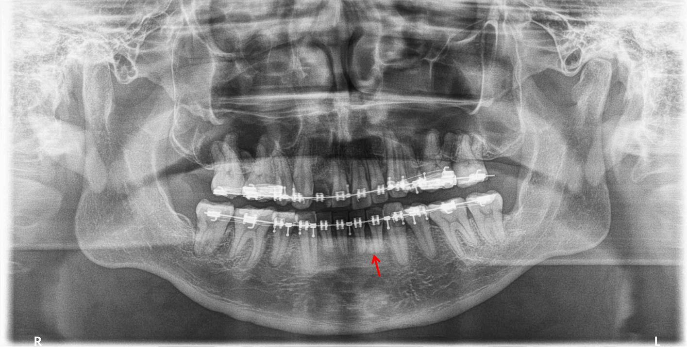 En la radiografía panorámica (Fig.1) se observa la presencia de aparatología fija para ortodoncia en el maxilar superior y en la mandíbula, además, se observa una imagen radiopaca de límites definidos (flecha roja) proyectada sobre el tercio apical radicular del órgano dentario 32. Nótese la reabsorción radicular externa a nivel apical en los órganos dentarios anteriores, a predomino en el maxilar superior probablemente condicionada por el tratamiento de ortodoncia.