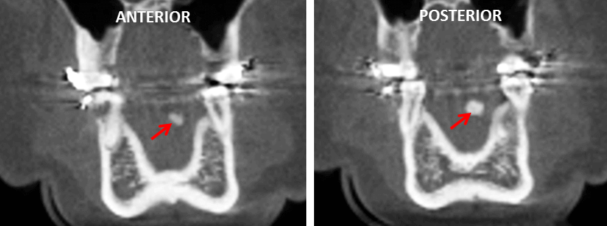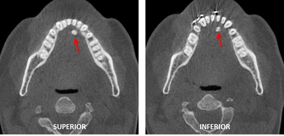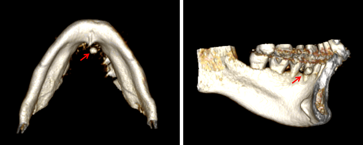 En la evaluación tomográfica con tomografía computarizada cone beam, se realizó la reconstrucción panorámica del maxilar inferior y los cortes transaxiales a nivel de los órganos dentarios 31 y 32 (Fig.2), donde se observa la presencia de una imagen hiperdensa localizada por lingual a nivel del piso de boca.