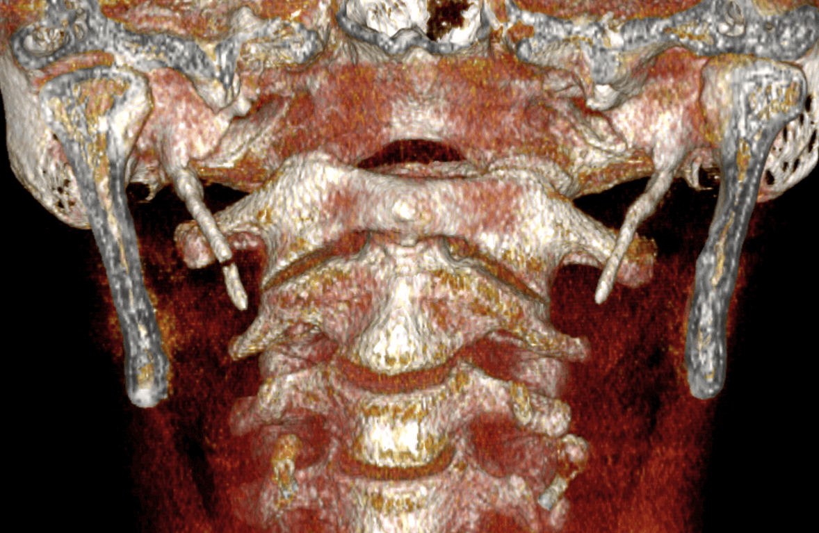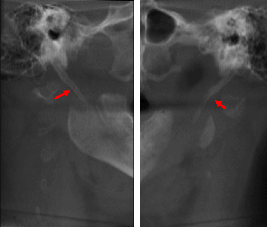En la evaluación con tomografía computarizada cone beam, en el corte coronal (Fig.1) se observa un elongamiento o extensión de la apofisis estiloides de ambos lados, evidenciando un patrón de calcificación segmentado en el lado derecho.