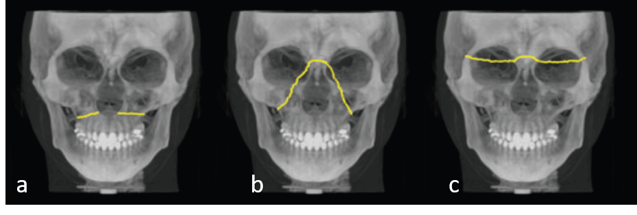 La parte media de la cara comprende los huesos nasal, maxilar y cigomático. Las fracturas en esta región afectan a estructuras que rara vez se fracturan por sí solas, pero que pueden dar lugar, en la mayoría de los casos, a fracturas multifragmentarias o complejas. Estas estructuras son capaces de soportar una fuerza considerable desde abajo, pero son relativamente fáciles de fracturar como resultado de fuerzas normales aplicadas desde otras direcciones. A diferencia de la protección rígida de la mandíbula, las fracturas de la parte media de la cara pueden afectar a varias estructuras importantes, incluida la base del cráneo, que pueden no evaluarse adecuadamente con las imágenes convencionales. La TCCB es capaz de mostrar un mayor número de líneas de fractura y fragmentos en comparación con las imágenes convencionales, representando con precisión la posición y la orientación de los fragmentos desplazados en un intervalo de tiempo razonablemente corto. Clásicamente, los estudios de Rene Le Fort han sido la base para clasificar estos tipos de fracturas ofrecieron una excelente revisión de estas fracturas.
