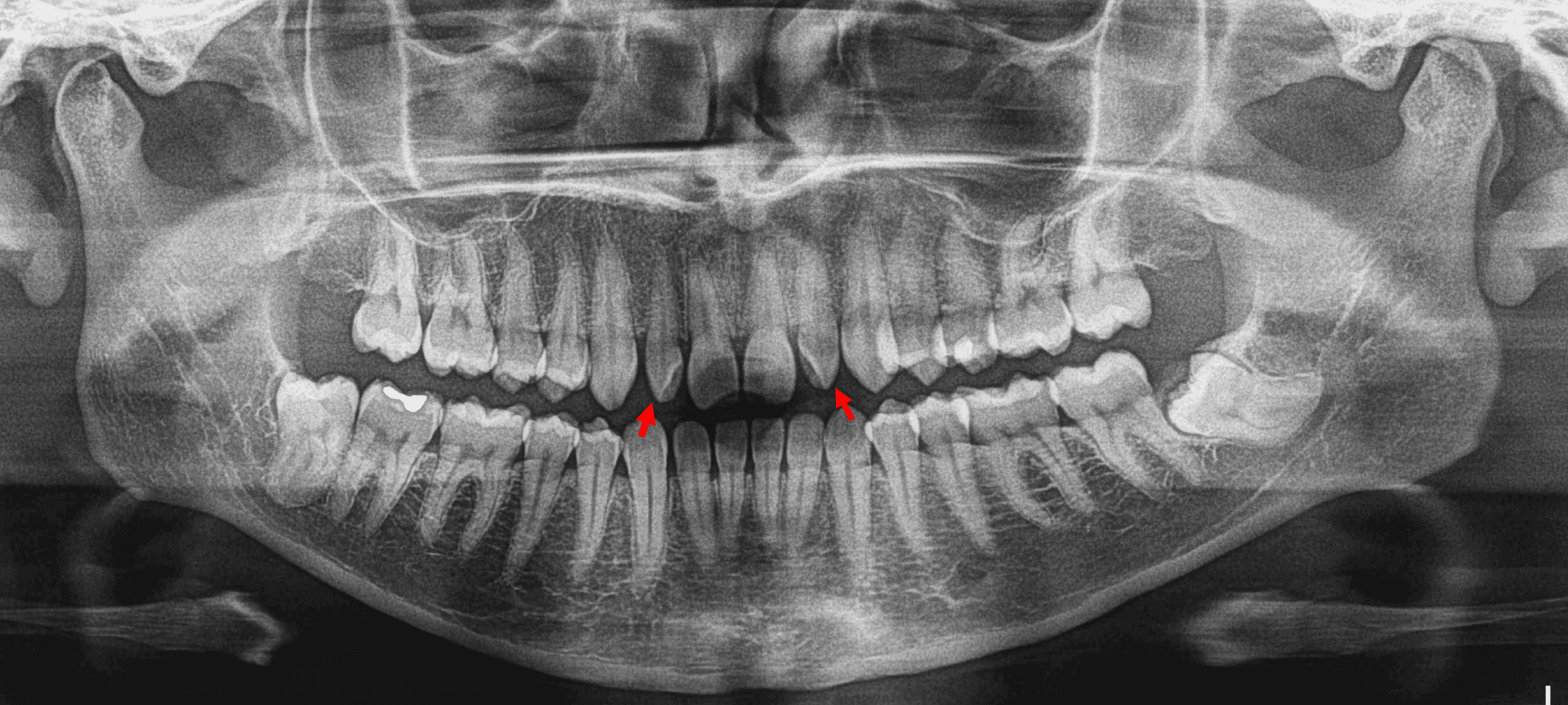 Paciente femenina de 32 años de edad es referida a la consulta radiológica para la evaluación de un tercer molar mandibular por referir molestias en la parte posterior del maxilar inferior. En la evaluación radiográfica se identificó un anomalia dentaria en los dientes anteriores.