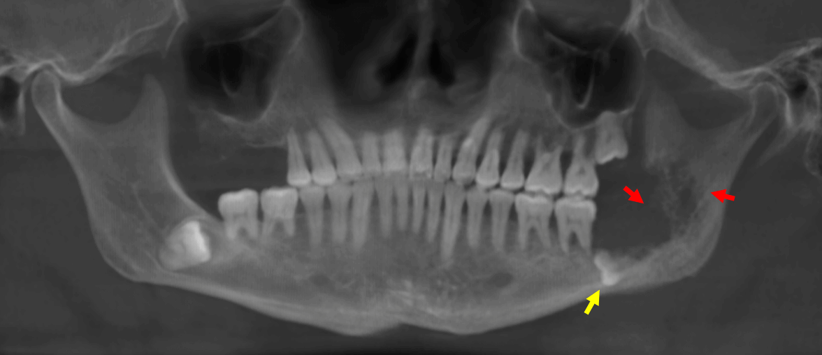 En la evaluación con tomografía volumétrica cone beam se observa la reconstrucción panorámica de ambos maxilares (Fig.1) donde se evidencia un defecto óseo de limites parcialmente definidos (flechas rojas) que compromete el cuerpo mandibular, la zona retromolar y los dos tercios inferiores de la rama ascendente mandibular y la presencia del tercer molar en posición horizontal, proyectado a nivel del reborde basal mandibular (flecha amarilla).