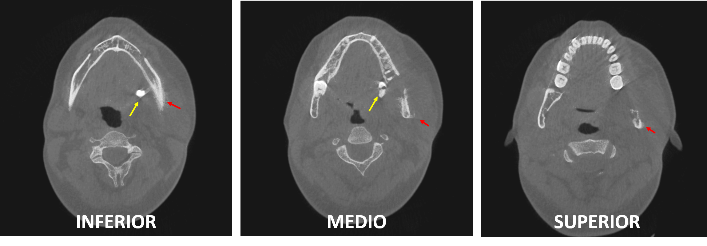 En cortes axiales (Fig.2) se observa que el órgano dentario 38 se encuentra fuera del hueso alveolar, en el tejido blando por lingual (flecha amarilla), al lado del defecto óseo antes mencionado, donde observa también el compromiso de ambas tablas óseas. En el hueso mandibular se observan imágenes hiperdensas dependientes de la tabla ósea vestibular y lingual a nivel del cuerpo mandibular, que se extienden hacia los dos tercios inferiores de la rama mandibular (flechas rojas), evidenciando signos tomográficos compatibles con una reacción perióstica.