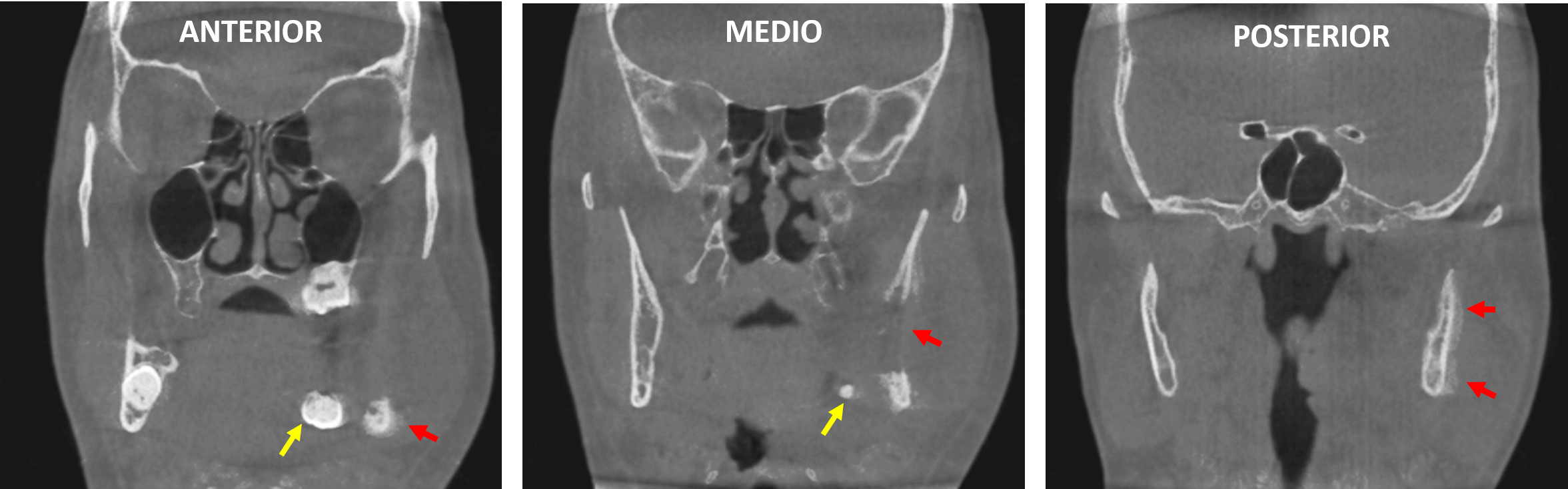 En cortes coronales (Fig.4) se observa el gran defecto óseo en cuerpo y rama mandibular y las imágenes de menor densidad dependientes de la tabla ósea por vestibular (flechas rojas) y el órgano dentario 38 por fuera del hueso, en el tejido blando por lingual.