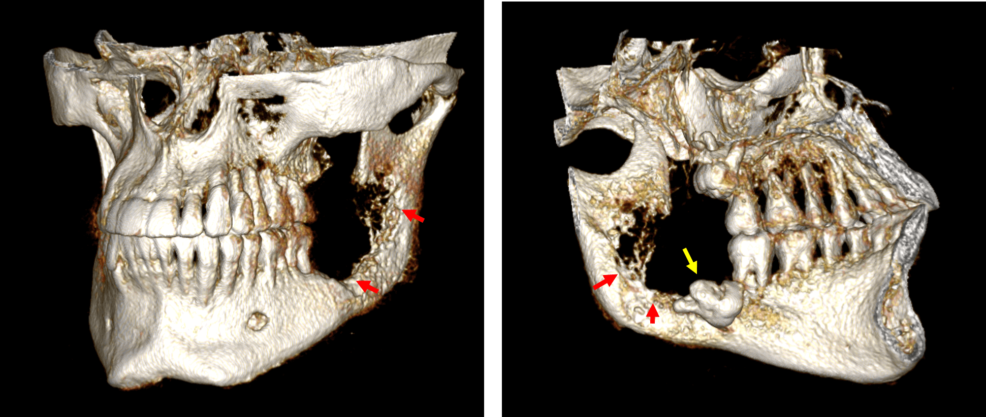 En la reconstrucción tridimensional (Fig.5) se observa el gran defecto óseo condicionado por la lesion osteolítica que compromete el hueso alveolar, la región retromolar y los tercios inferiores de la rama mandibular (flechas rojas), presentando signos tomográficos de una aparente lesion infecciosa del hueso mandibular. Asi mismo, se observa el órgano dentario 38 fuera del hueso por lingual.