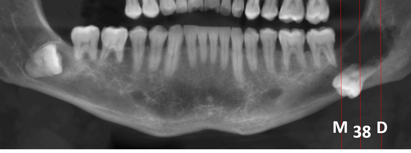 En la evaluación con tomografía computarizada cone beam, se realizó la reconstrucción panorámica del maxilar inferior (Fig.1) en la cual se observa el órgano dentario 38 en aparente posición mesioangular e invertida con la corona en relación con el reborde basal mandibular, asi como una lesion osteolítica la cual compromete las raíces de este tercer molar, extendiéndose de forma superior hasta el reborde alveolar y comprometiendo el tercio inferior de la rama ascendente. Asi mismo, se observa la impactación del órgano dentario 48, en posición mesioangular y con la corona en relación con una imagen hipodensa a nivel pericoronario. Además, se observa el acortamiento de la longitud radicular en las raíces de los órganos dentarios 46 y 47.