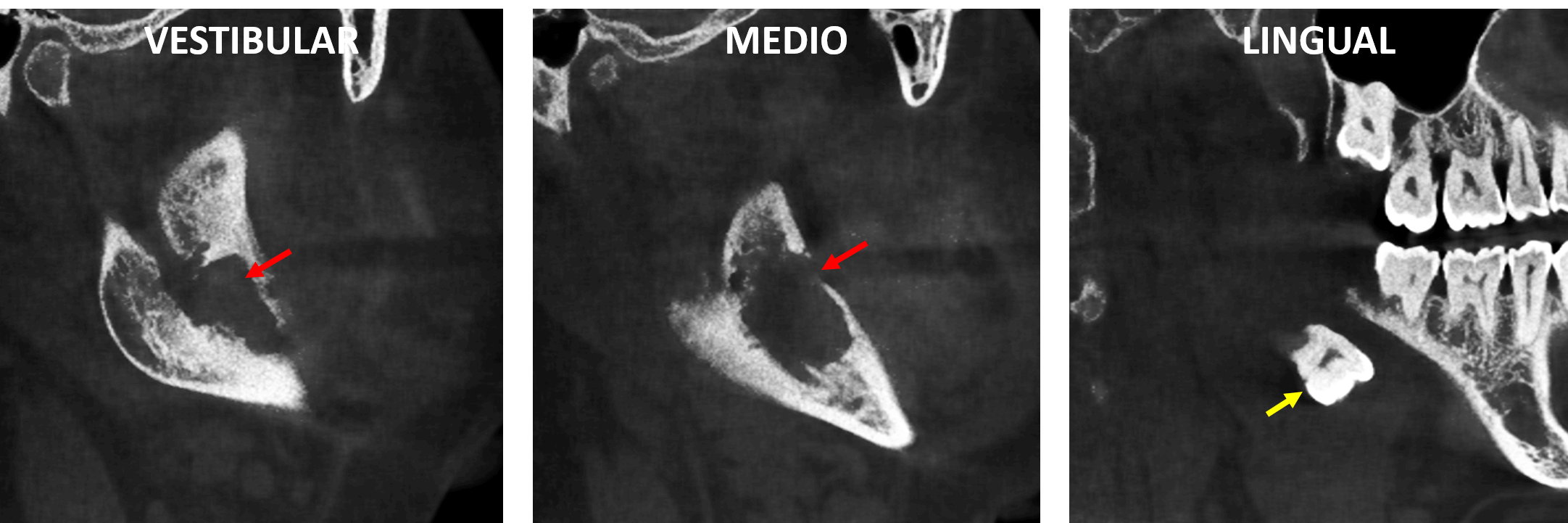 En cortes transaxiales (Fig.2) y en cortes axiales (Fig.3) se observa el órgano dentario 38 localizado por lingual en el tejido blando adyacente al cuerpo mandibular (flechas amarillas), donde se observa también la ausencia de la tabla ósea lingual, asi como la ausencia parcial de la tabla ósea externa en relación con una imagen hipodensa amplia sugerente de un lecho quirúrgico que compromete también el cortical superior del conducto dentario inferior. Nótese las tenues imágenes hiperdensas dependientes de la tabla externa e interna (flechas rojas) sugerentes de una neoformación ósea compatible con una reacción perióstica.