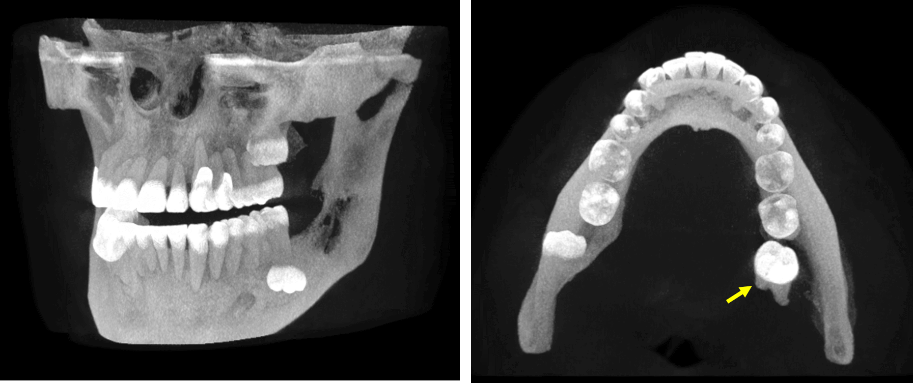 En la representación tridimensional (Fig.5) se observa el desplazamiento lingual del órgano dentario 38, por fuera de la estructura mandibular y localizada en el interior del tejido blando por lingual, lo cual sugiere el desplazamiento del órgano dentario en relación con una secuela quirúrgica.