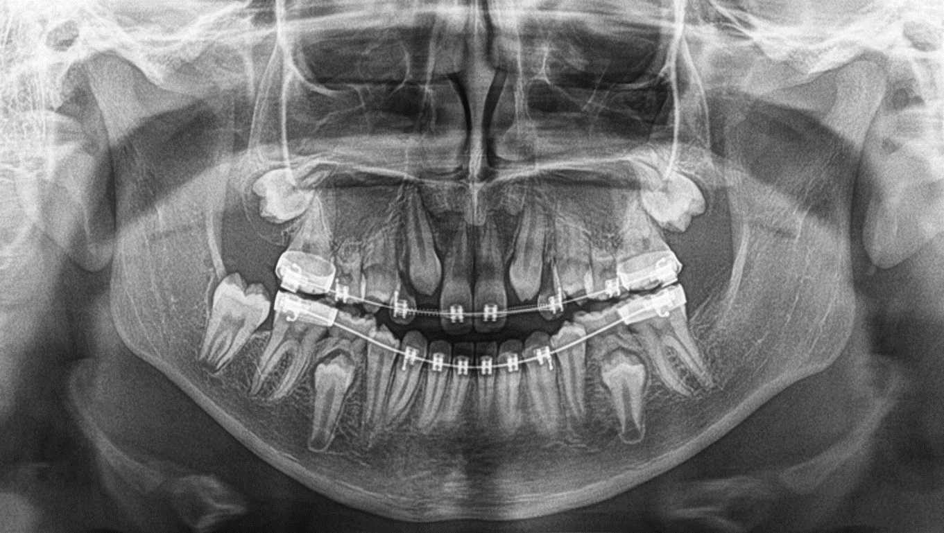 En la evaluación de la radiografía panorámica se observa los segundos molares superiores en vías de erupción, la ausencia congénita de los segundos premolares y los caninos superiores también en vías de erupción. En el maxilar inferior se observa la ausencia del órgano dentario 37 y los segundos premolares inferiores en vías de erupción. Nótese también la ausencia de los gérmenes dentarios de los terceros molares superiores e inferiores y la aparatología para ortodoncia en la maxilar superiores e inferior, probablemente condicionando el ensanchamiento del espacio periodontal del órgano dentario 43.